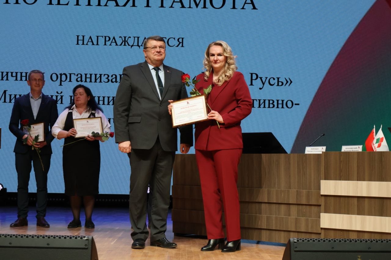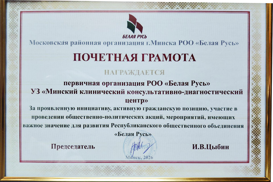 27.03.2026Первичная организация РОО «Белая Русь» Минского клинического консультативно-диагностического центра награждена Почётной грамотой Московской районной организации г. Минска РОО «Белая Русь».